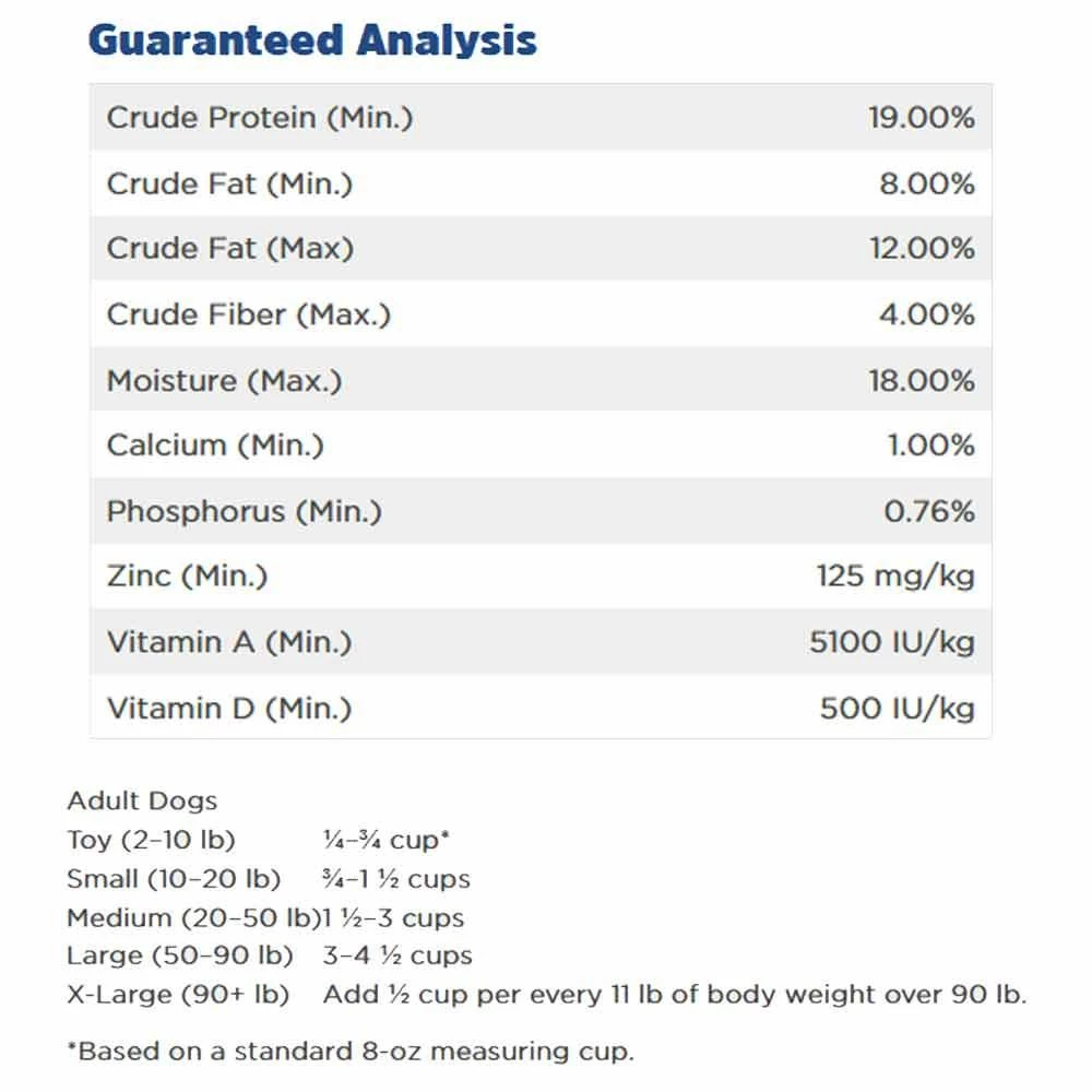 | Feeding Directions | Feed an adult dog the recommended amount once a day. Activity environment breed and age all can affect energy needs. Adjust these feeding amounts to maintain optimum body condition. |