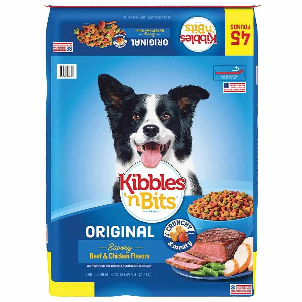 The Kibbles 'n Bits Original blend features the same variety of tastes and textures that always gets tails wagging! This antioxidant-rich dry dog food contains high quality ingredients including vegetables plus 23 essential vitamins & minerals. The signature mix of crunchy kibble and meaty bits make a delicious meal with complete and balanced nutrition that you can feel good about serving every day. 100% complete and balanced nutrition for adult dogs of all sizes. Fortified with 23 essential vitamins and minerals – antioxidant rich.