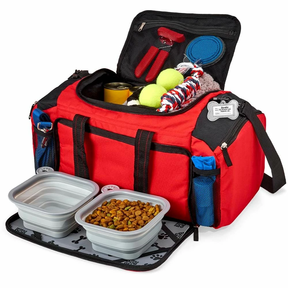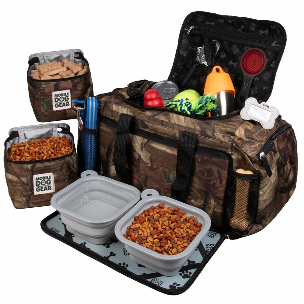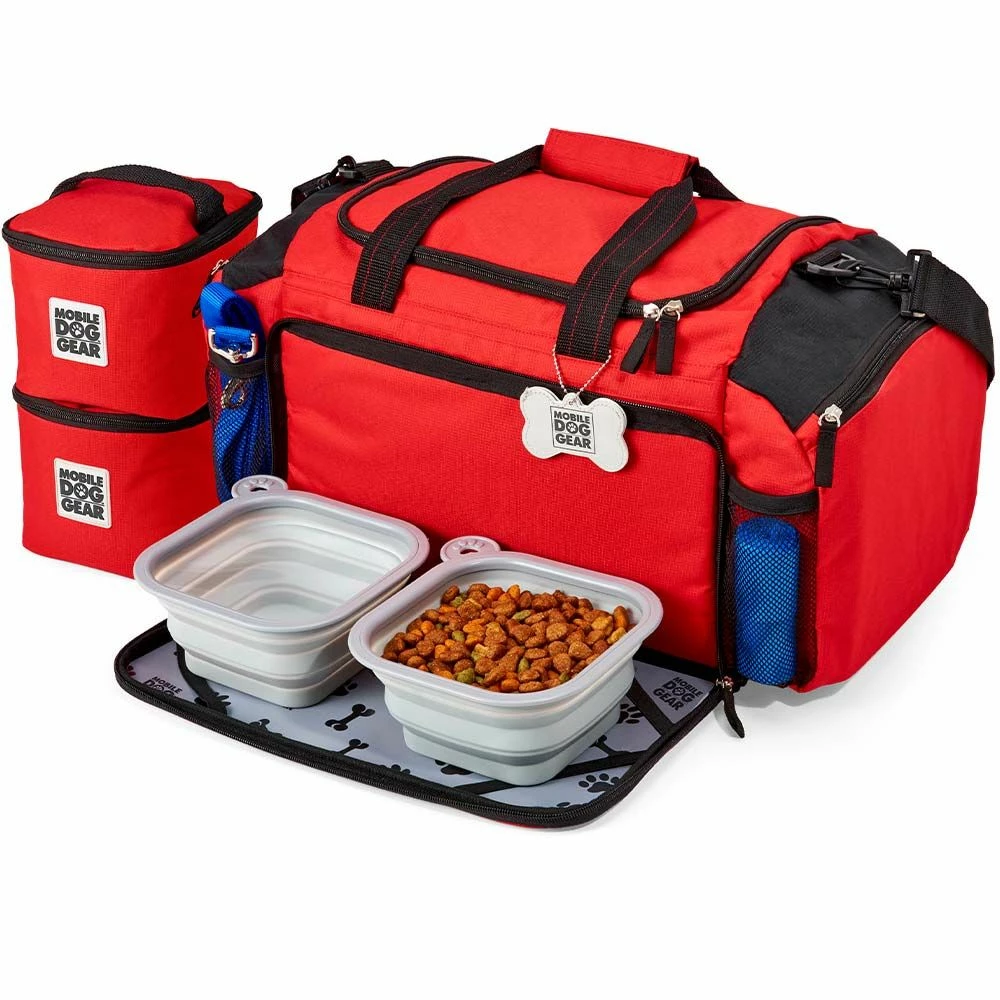 Whether your adventures are near or far, Mobile Dog Gear’s Ultimate Week Away Duffle makes it simple to travel with your dog! Mobile Dog Gear Ultimate Week Away Duffle provides a patent pending feeding system that includes collapsible silicone bowls, insulated food/treat carriers and a removable placemat. Our organized luggage system with accessories that now makes it simple to travel with your dog for any length of time. This dog luggage features: large main compartment, divider for food carriers, zippered inside mesh pocket, back mesh pocket, adjustable padded shoulder strap, and mesh pocket on sides. Also included are 2 lined food carriers (30 cups total), placemat, and 2 collapsible silicone bowls that store conveniently in the front flap. Additionally, this travel bag meets most airline carry-on requirements, and features a luggage sleeve that fits over a suitcase pull up handle and an ID luggage tag. This isn’t your average pet bag! The high end heavy duty ripstop polyester material will last without the concern of it wearing out or falling apart. This durable material is both lightweight and easy to clean, and can handle the “ruff” and tumble of on the go. This expertly designed bag will have your pet traveling in style!