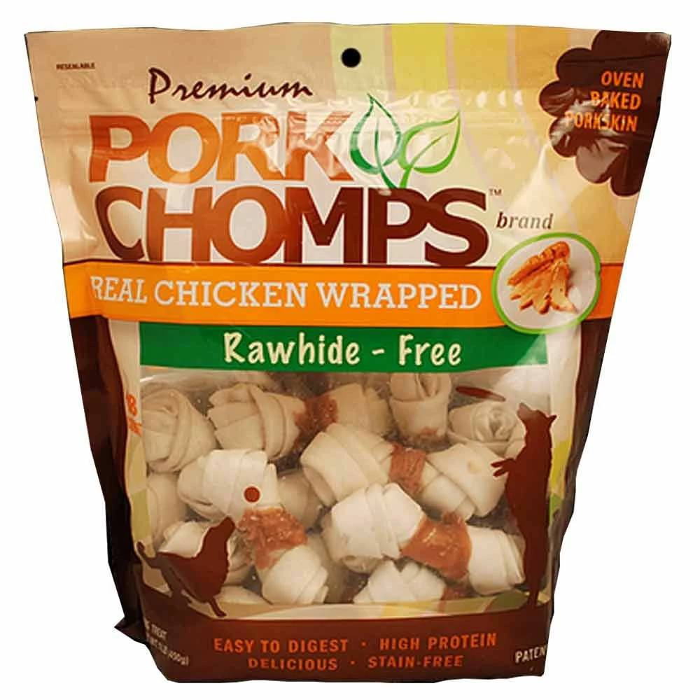 Pork Chomps™ Small Chicken Knotz are rawhide free dog chews. Wrapped in mouthwatering chicken flavor and offering the enticing texture of pig skin, each of these knotted dog treats indulges your dog's cravings and is a truly satisfying reward. The fun bone shape and chewable texture help keep your dog entertained and active.