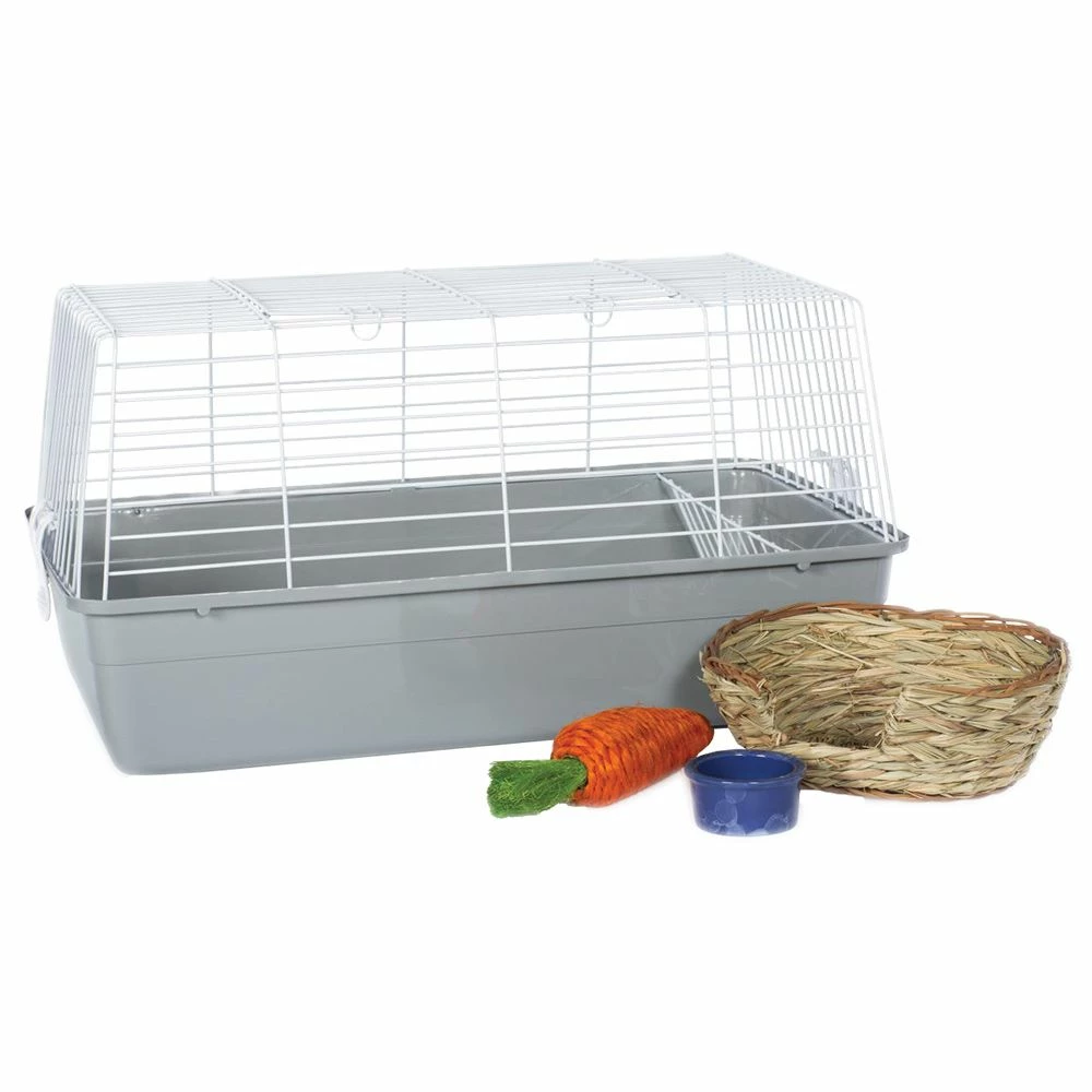 Prevue Pet Products Bella Cage Kit is ideal for guinea pigs and rabbits. It features an all-welded mesh with 1 in. wire spacing top, and a large top-opening door. The deep base has a built-in angled hayrack. Snap-off end clips hold the mesh securing in place and remove easily for cleaning. Kit includes a ceramic food bowl, carrot chew toy and woven pet basket.