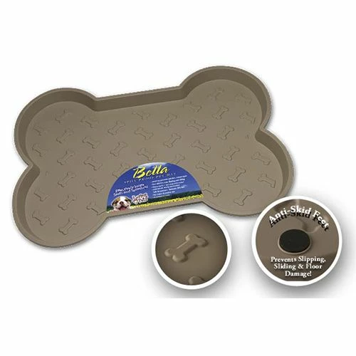 Bella® Spill-Proof Bone Shaped Dog Mat stylishly prevents splashes and retains spills. Bella Spill-Proof Dog Mat has raised edges for maximum spill capacity, a slip-resistant, bone-embossed surface, and anti-skid feet to prevent slips, slides, noise and floor damage. Non-toxic, BPA-free and quality tested. For both indoor and outdoor use. Cleans easily, just rinse with water.