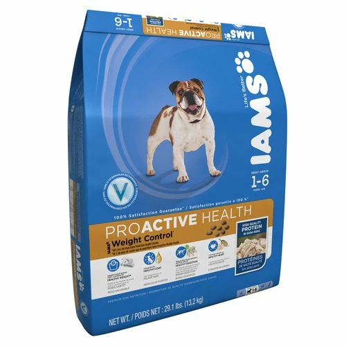 Iams ProActive Health Weight Control Dog Food 29.1 Lb. is formulated with L-Carnitine to gradually return your dog to a healthy weight* and keep him fit. Natural sources of protein sourced from chicken and egg helps build strong, firm muscles and antioxidants help maintain a strong immune system. Crunchy kibbles scrub your dog's teeth with every bite, reducing plaque and tartar buildup that can lead to bad breath. Vet recommended, this premium dog food is 100% complete and balanced, with no fillers or artificial preservatives.