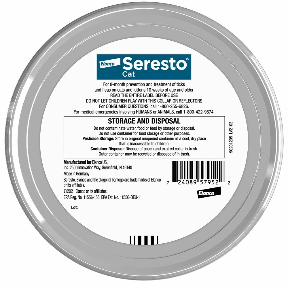 <p>Seresto® Cat is a flea and tick collar for 8-month prevention and treatment of ticks and fleas on cats and kittens 10 weeks of age and older. This collar is designed with a safety-closure mechanism. In the unlikely event of a cat being trapped, the cat’s own strength is sufficient to widen the collar to allow for quick release. Light reflectors for added visibility in the evening and at night.<br /><br />The Seresto collar prevents tick infestations within 48 hours after application amd repels and kills ticks for 8 months. This includes Deer ticks (vector of Lyme disease and anaplasmosis), American dog ticks (vector of Rocky Mountain spotted fever, cytauxzoonosis and ehrlichiosis), Brown dog ticks (vector of ehrlichiosis, anaplasmosis, babesiosis, and Rocky Mountain spotted fever), and Lone Star ticks (vector of cytauxzoonosis and ehrlichiosis).</p> <p><br />The Seresto® cat collar quickly kills fleas on cats within 24 hours and continues to prevent infestations for 8 months. Treatment with Seresto kills fleas that may transmit bartonellosis (Bartonella henselae), tapeworm infections (Dipylidium caninum), feline infectious anemia (Mycoplasma spp.), and rickettsiosis (Rickettsia felis).</p> <p><br />Re-infesting fleas are killed within 2 hours with protection against further flea infestation lasting 8 months. Kills and repels fleas before they lay eggs. Aids in the control of flea larvae in the cat’s surroundings following contact with a Seresto-treated cat. Aids in the treatment and control of Sarcoptic mange.</p> <p><br />Bayer Polymer Matrix ensures that both active ingredients are slowly and continuously released in low concentrations. Make sure to replace the collar after 8 months for year-round pest prevention.</p> <p><strong><br />HOW TO APPLY:</strong><br />One collar per animal to be fastened around the neck. Remove collar from protective bag directly before use. Unroll collar and make sure that there are no remnants from the plastic connectors inside the collar.</p> <p><br />Insert end of the collar through the buckle. Adjust the collar around the animal’s neck without tightening it too tight (as a guide, it should be possible to insert 2 fingers between the collar and the neck). Pull excess collar through the loop(s) and cut off any excess length extending 1 inch (2 cm) beyond the loop(s).</p> <p><br />After application of the collar, three reflector clips may be fixed permanently to the collar to increase the animal’s visibility in the dark. Take the clips out of the bag. The clips should be evenly distributed on the non-overlapping part of the collar. The clips are correctly applied when a clicking sound is heard. For safety reasons once the reflectors are fixed to the collar the clasp closes permanently and cannot be re-opened.</p> <p><br />The collar should be worn continuously for the 8 month protection period. Check periodically and adjust fit if necessary, especially when kittens are rapidly growing.</p> <p><br />Replace the collar after 8 months for optimal tick and flea protection.</p>#html-body [data-pb-style="62160445EBD58"]{justify-content: flex-start; display: flex; flex-direction: column; background-position: left top; background-size: cover; background-repeat: no-repeat; background-attachment: scroll; border-style: none; border-width: 1px; border-radius: 0px; margin: 0px 0px 10px; padding: 10px;}#html-body [data-pb-style="62160445EBD78"]{border-style: none; border-width: 1px; border-radius: 0px; margin: 0px; padding: 0px;}