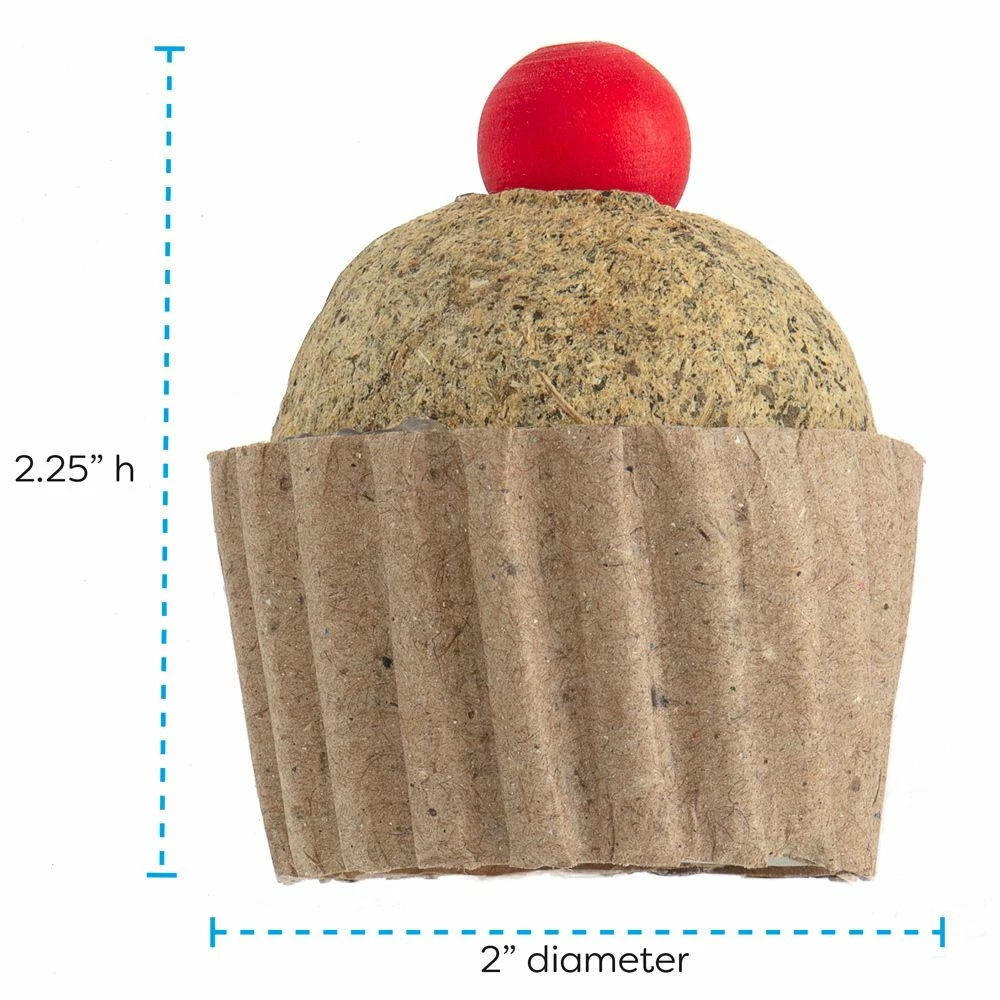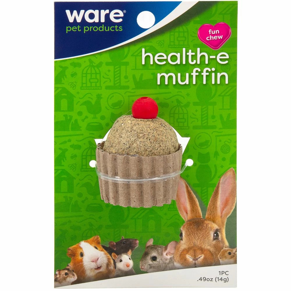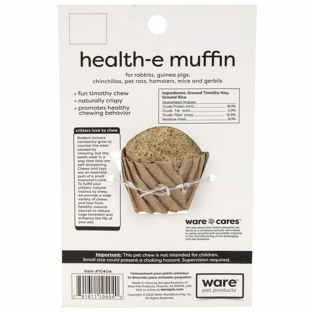 The Health-E Muffin contains fiber rich Timothy Hay to help promote digestion. This naturally crunchy chew is made with ground Timothy Hay and Rice wrapped in cardboard with a wooden cherry on top using animal safe food colors. Helps overcome cage boredom. Recommended for rabbits, guinea pigs, chinchillas, pet rats, hamsters, mice and gerbils.