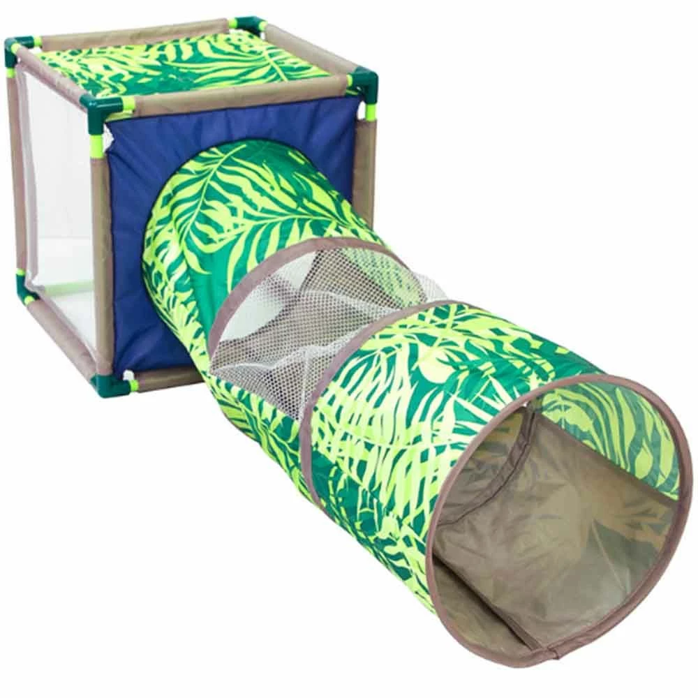 Does your favorite furball have a bit of energy to burn? Then he’s going to go wild for the Jungle Party Cat Cove. The main cove of this festive tropical playset has two levels for your cat to climb and explore, with mesh panels to spy through whenever he’s curious about what’s happening in the room never mind those eyes peering from the underbrush! A run tunnel with mesh panels makes the main entrance for the cover, and offers the perfect spot to hide and pounce. Hanging ribbons inside are just the ticket for a bit of swatting fun. And once your cat is good and tired from playing? He can curl up inside for a cozy catnap, or bask in the light resting on the supportive top instead. Great as the play set is for a curious cat, there’s plenty for you to love about the Jungle Party Cat Cove as well. It’s minimal effort to put together, and the tunnel collapses for easy storage whenever you need a bit more space in the living room. Bring one home and let the party get rolling in your home today!