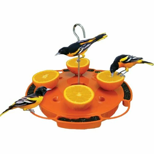 Songbird Essentials Ultimate Oriole Feeder feeds nectar, jelly and oranges all at the same time. There is a built in ant moat that keeps ants out of the Oriole's treats. This feeder holds 4 halves of real oranges in such a way that ant moat can still be filled with water and be effective. It also holds 1 quart and jelly.
