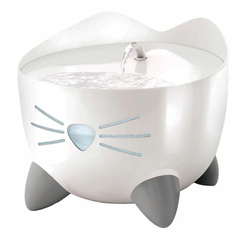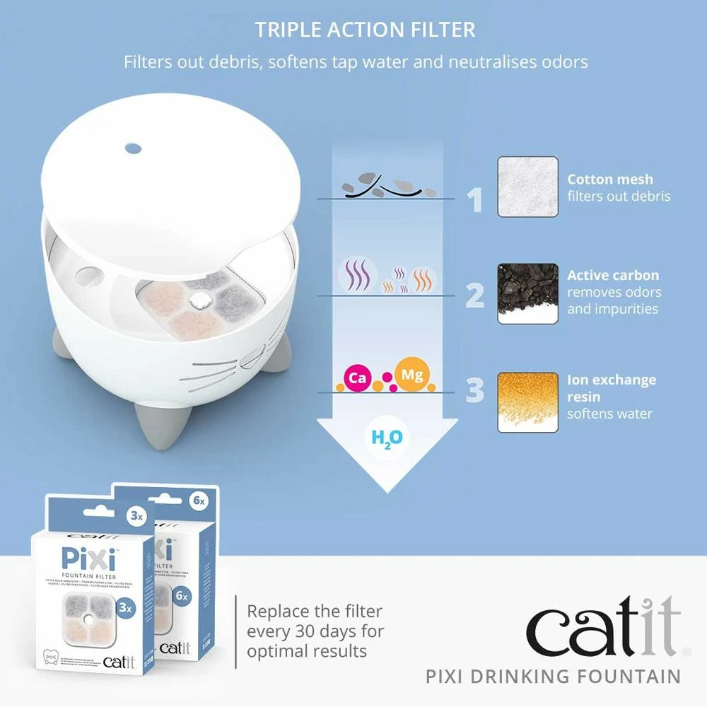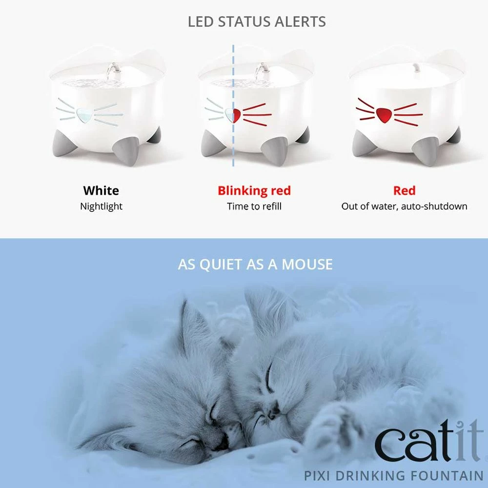 The Catit PIXI Fountain provides your cat with a continuous source of fresh, purified water. Running water encourages cats to drink more, which helps prevent urinary tract diseases. The PIXI has a triple action filter that softens water and removes debris. The see through nose keeps you updated on low water levels and acts as a nightlight.