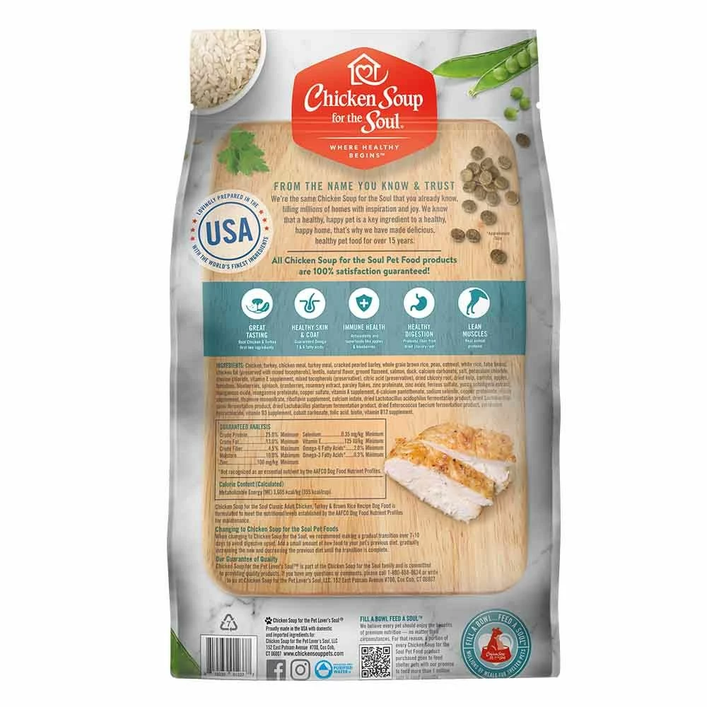 Chicken Soup for the Soul Classic Adult Dry Dog Food Chicken, Turkey & Brown Rice Recipe features real chicken as the #1 ingredient and real turkey as the #2 ingredients. Classic Adult Dry Dog Food Chicken, Turkey & Brown Rice Recipe is made with out by-product meals, wheat, corn, soy, artificial colors, preservatives or flavors. It is lovingly prepared in the USA with the world's finest ingredients. Omega 3 and 6 fatty acids provide a healthy skin and coat. The antioxidants and superfood like apples and blueberries support immune health. Prebiotic fiber from dried chicory root aids in healthy digestion while the real animal proteins provide lean muscles in your pet.