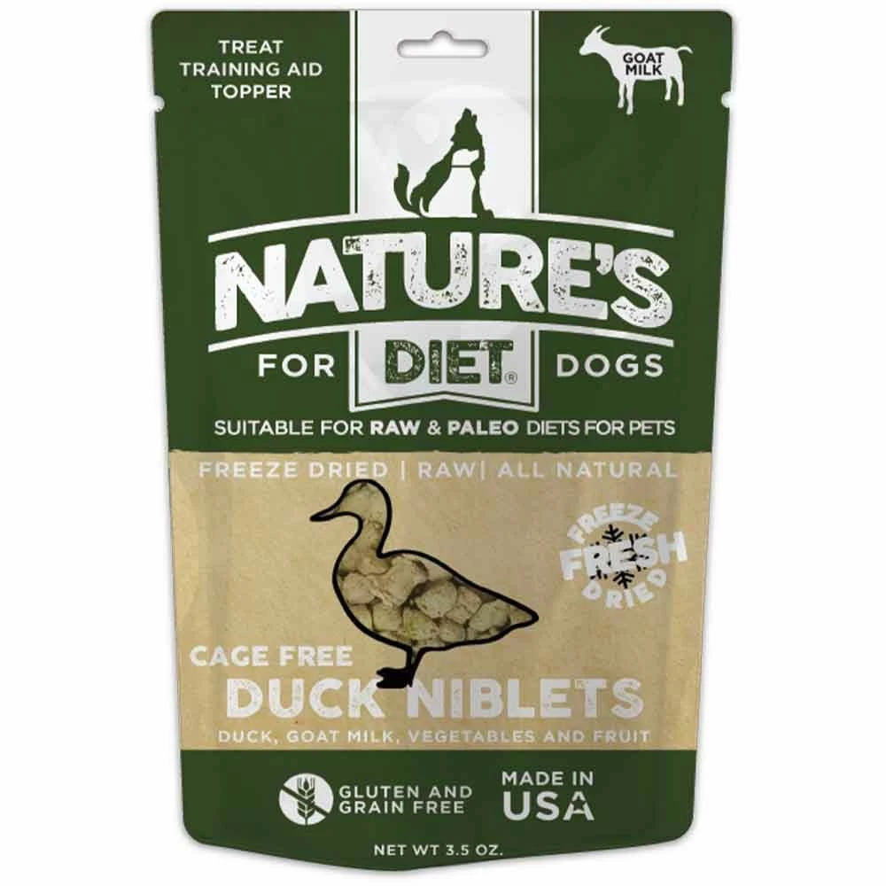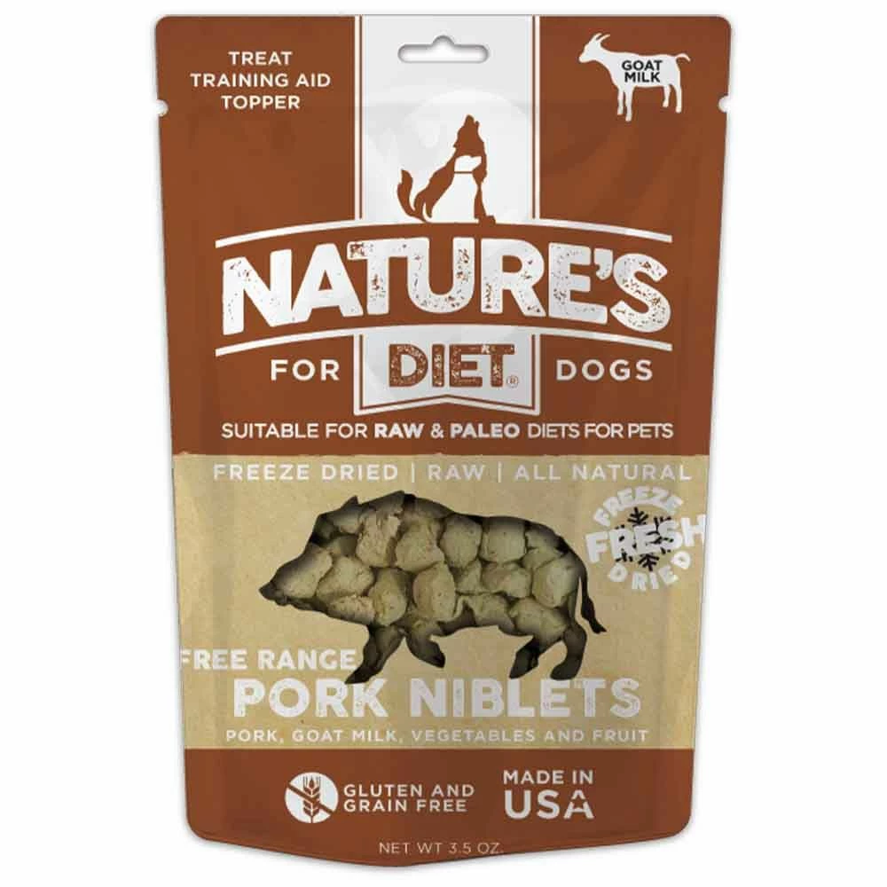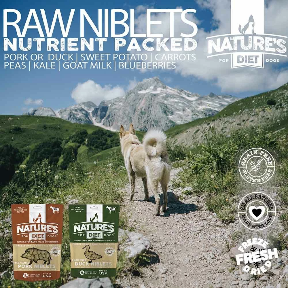 Nature's Diet Freeze Dried Treats and Meal Topper Niblets for Dogs are made from all raw free range meat, goat milk, vegetables and fruit. These wholesome raw ingredients are blended together without any additives, preservatives or fillers and then shaped into bite size pieces of raw deliciousness. Nature’s Diet then freeze dries each morsel to remove moisture and eliminates any spoilage concerns while retaining all the nutrition and taste of the fresh raw meat, fruit and vegetables. You can feed with confidence that Nature's Diet Treat and Meal Topper Niblets contain no gluten or grain. High in protein, calcium and nutrients, your dog will love them and you’ll know you are feeding your dog the best. Made lovingly in small batches in the USA.