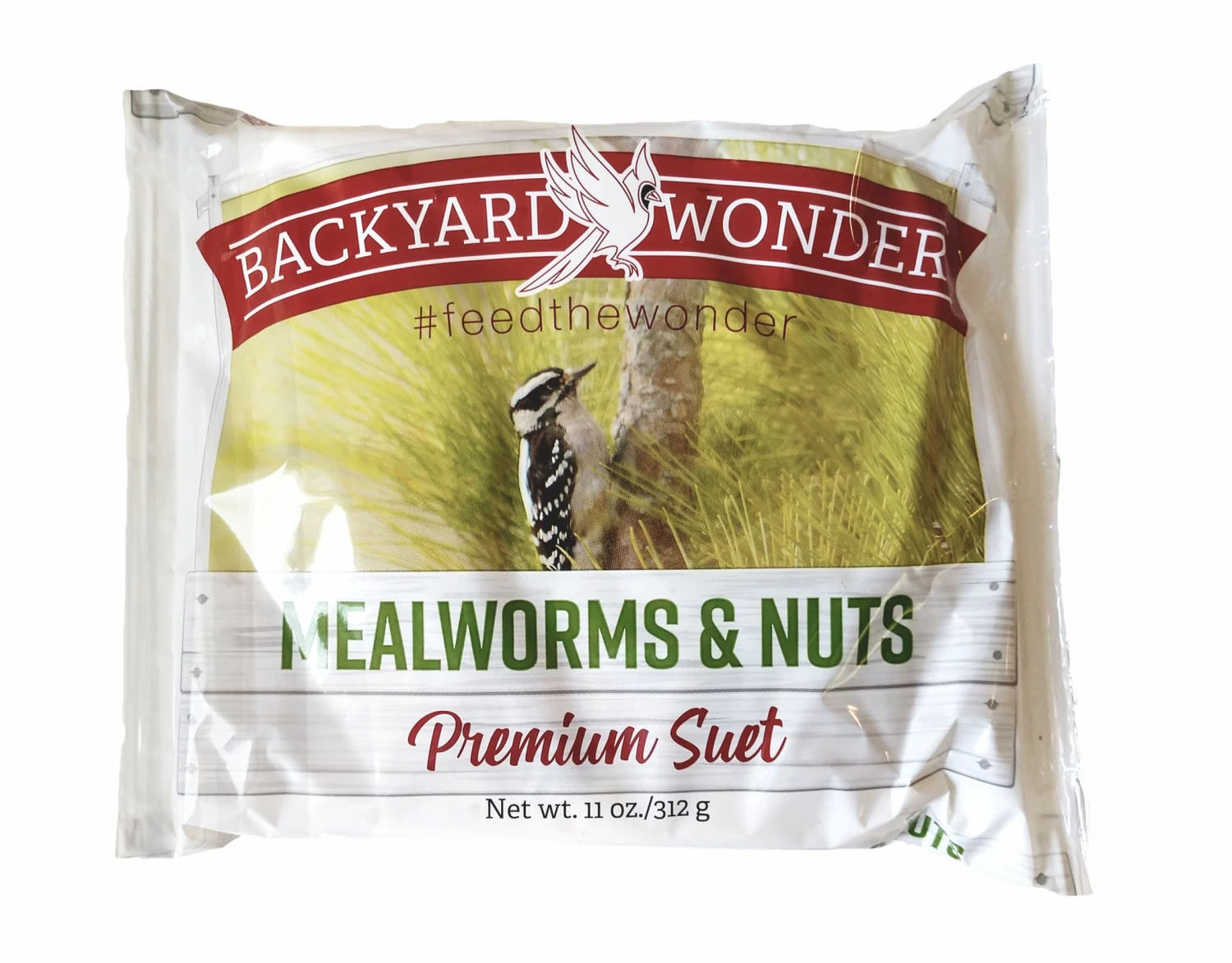 Backyard Wonder® Mealworms & Nuts Blend Premium Suet is made with rendered beef suet, cracked corn, millet, peanut pieces, dehydrated mealworms and processed grain by-products. It is great for year round feeding, attracting multiple species. This suet is great for "No Mess" feeding. Not for human consumption. Wash hands after contact with bird feeders or feed. This product is natural and non-sterilized. #html-body [data-pb-style="6216044929820"]{justify-content: flex-start; display: flex; flex-direction: column; background-position: left top; background-size: cover; background-repeat: no-repeat; background-attachment: scroll; border-style: none; border-width: 1px; border-radius: 0px; margin: 0px 0px 10px; padding: 10px;}#html-body [data-pb-style="6216044929840"]{border-style: none; border-width: 1px; border-radius: 0px; margin: 0px; padding: 0px;}
