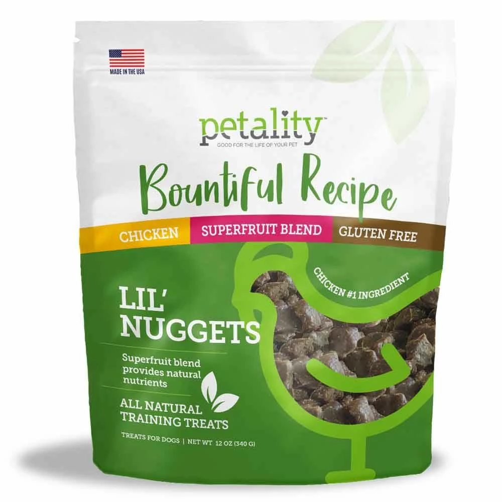 Petality Bountiful Recipe Lil' Nuggets are an all-natural bountiful blend of delicious real roasted chicken as the #1 ingredient combined with a nutritious, superfruit blend (cherries, blueberries, blackberries, cranberries). With no wheat, no corn, no soy and no artificial preservatives or ingredients, dogs love the long-lasting flavor and pet parents love that it is natural. Lil' Nuggets are a healthy training treat with a recipe full of nutrients and less than 2 calories per treat. Good for the life of your pet.