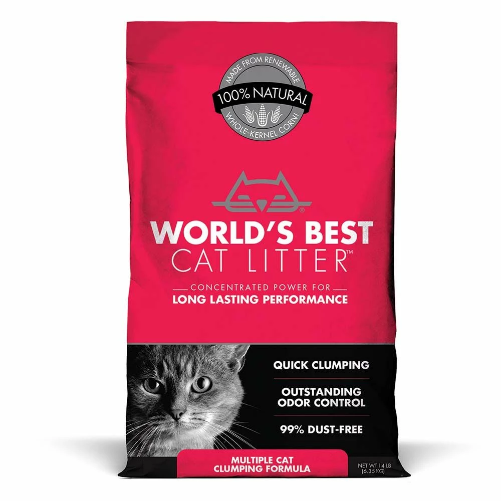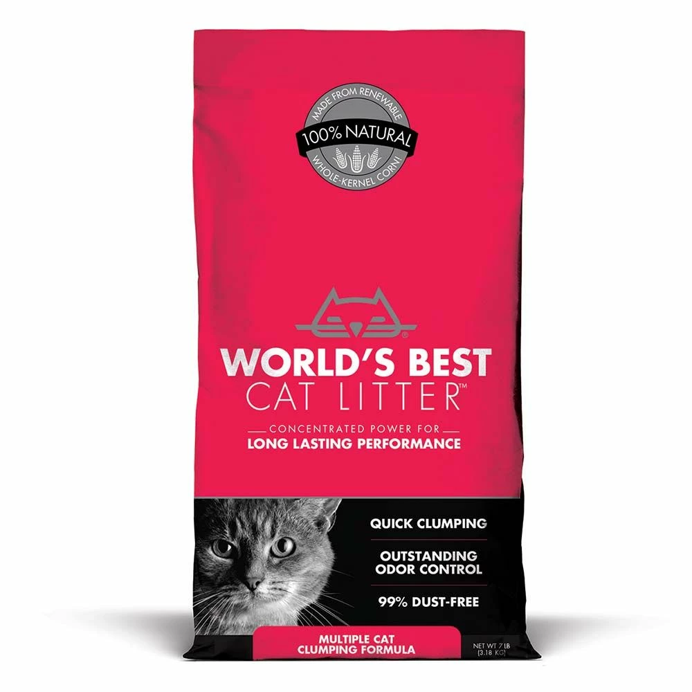 World's Best Cat Litter Multiple Cat Clumping Cat Litter gives a cleaner litter box with less cat litter. It's the concentrated power of corn. Unlike clay cat litter, only World's Best Cat Litter uses a patented process to compress naturally absorbent corn into concentrated granules that TRAP ODOR DEEP INSIDE and FORM TIGHT CLUMPS ON CONTACT. Now you can do more, save money, and save the environment with less litter. If you have more than one cat, you can't settle for less than the best clumping cat litter. That's why World's Best Cat Litter started with the concentrated power of corn, and added an all-natural plant ingredients for even more outstanding odor control. Plus, it is quick clumping, easy scooping, and proven flushable for simple cleanup! It is 99% dust-free, safe for you kitty.